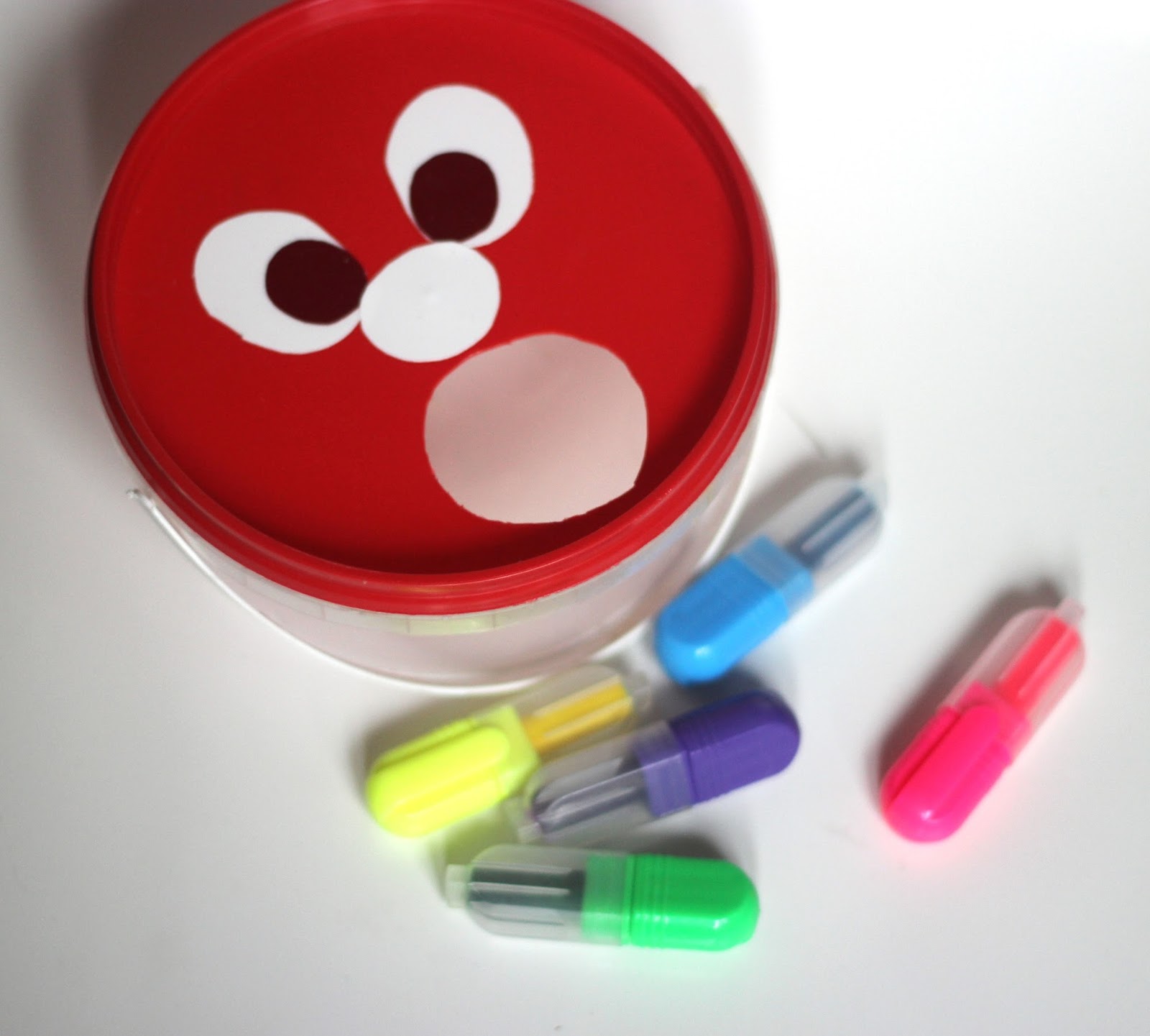 в качестве "корма" были выбраны отслужившие свой век маленькие маркеры... к счастью колпачки у них такие тугие, что открыть почти нереально. Вариант с шариками отпал, так как она из целиком засовывает в рот, не смотря на размер. А маркеры нужно еще повернуть нужной стороной, чтоб пролезли в отверстие.