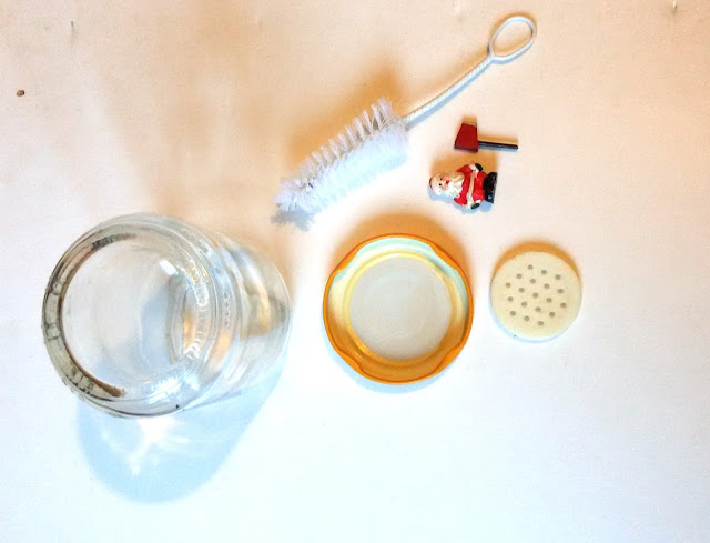 оторвали... потому что, когда сделали примерку, оказалось что вся наша конструкция не видна из-за того, что горлышко банки сужается... поэтому срочно пришлось исправлять положение! спаслисьмерной ложечкой для смеси, только ручку у нее отрезали... и снова все закрепили на крышке... теперь гораздо лучше!!